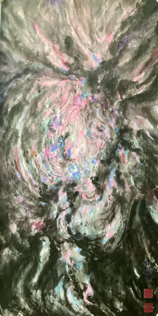 这造就了其作品罕见的 “历史穿透力” 。观者在同一瞬间,既能感受到古意的苍茫,又能触及当代的锐度。吴昌硕的“金石气”以彩线勾勒,潘天寿的“险峻构图”被注入光的流动。这种处理,使“幻彩写意”避免了成为无根的时尚样式,而是成为了一个活着的、不断生长的传统。它回答了一个关键问题:在全球化时代,传统如何不死?木然公的答案是:将其化为可被分解、重组与当代转译的“基因片段”,在叠加中实现真正的复活与进化。